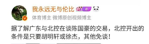 对于陈国豪,北控男篮方面也是有续约的打算的,不过也同时会遵循陈国豪个人的想法和意愿。也就是说,在陈国豪合同将会到期的情况下,如果他想要离开球队转会的话,北控男篮并不会阻拦。也就是在这样的情况下,广东男篮和北控男篮进行了沟通,商讨了双方交易陈国豪的可能性。这笔交易能否成功的关键,是广东男篮拿出来的交易条件能否让北控男篮满意。据体育博主“我永远无与伦比”透露,北控男篮已经把交易陈国豪的条件开了出来,那就是只想要胡明轩或者徐杰,其他球员免谈。